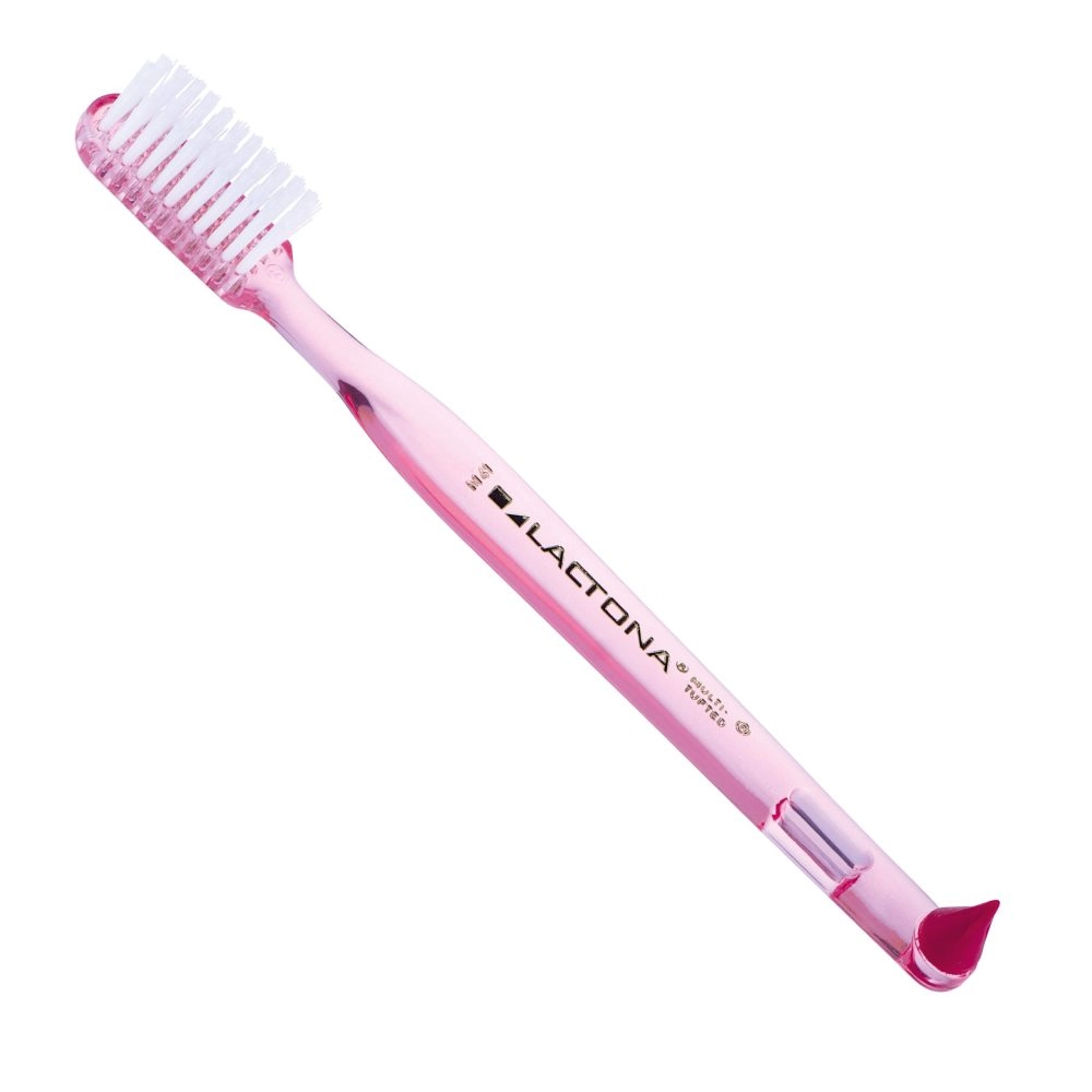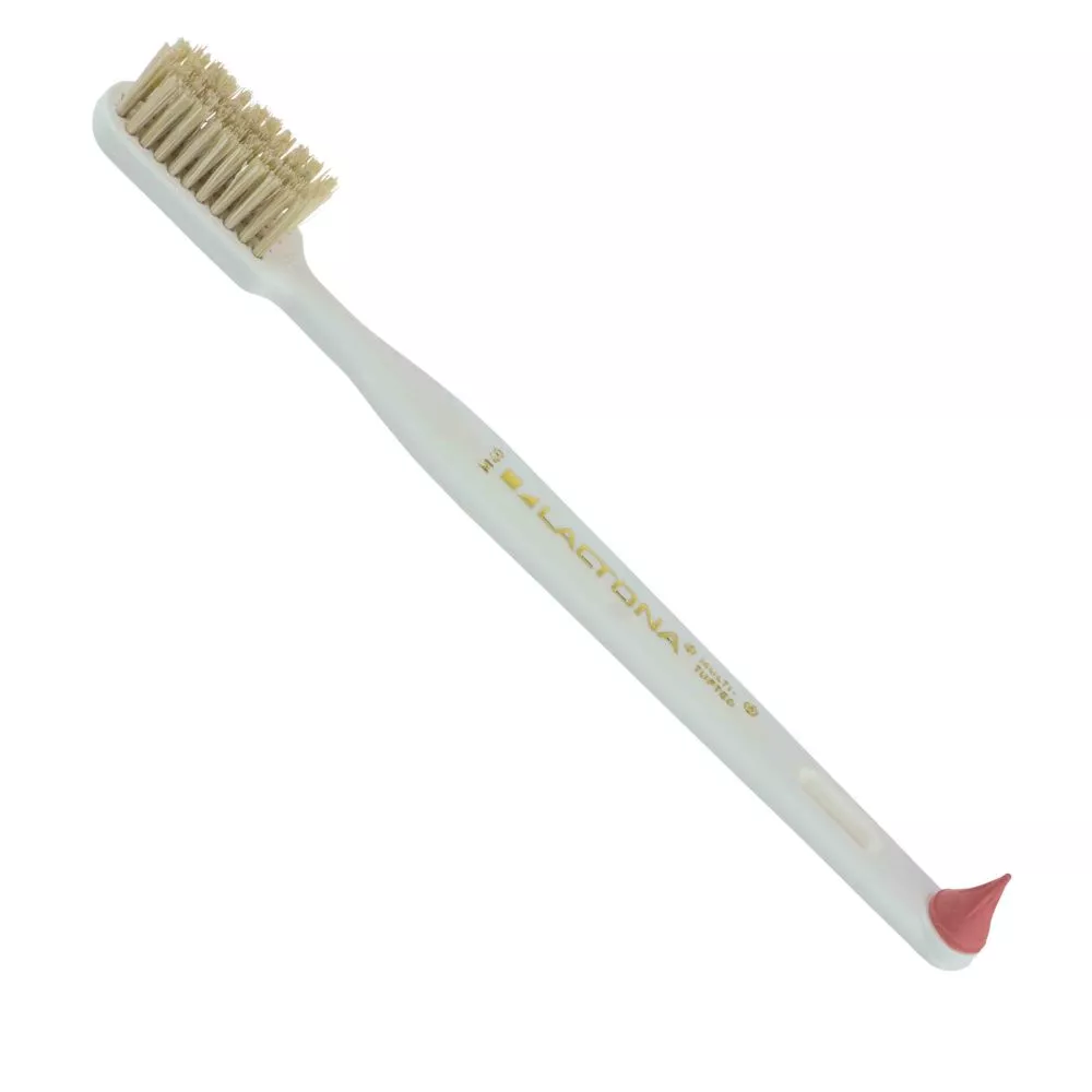 Todas as escovas de dentes Lactona são feitas de materiais de alta qualidade. As cerdas são feitas de Tynex® de alta qualidade e cuidadosamente arredondadas para reduzir danos aos dentes e gengivas.